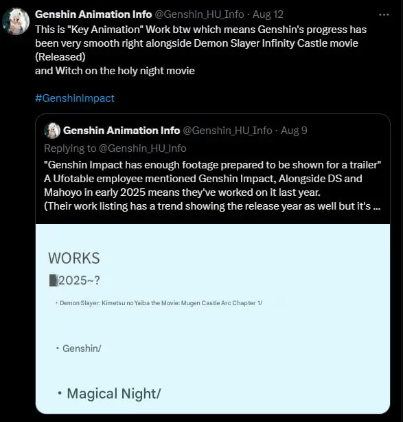 И вот на днях аккаунт Genshin Animation Info сообщил, что в студии Ufotable уже завершена стадия key animation – ключевых кадров, которые формируют основу каждой сцены. Примечательно, что этот этап шел параллельно с производством фильма Demon Slayer: Infinity Castle и экранизации Witch on the Holy Night.