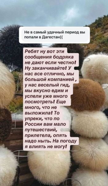 «Ребят, ну вот эти ваши сообщения „бодряка“ не дают, если честно! Ну заканчивайте! У нас все отлично: мы большой компанией, у нас веселый гид, мы вкусно едим и успели уже много посмотреть! Еще много чего не выложила!» — прокомментировала телеведущая.